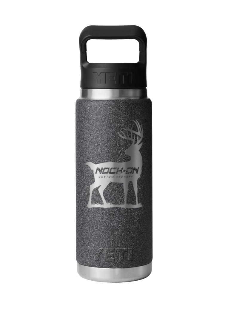 Our BRAND NEW Nock On x YETI 26oz water bottle in the classic black and silver colorway! Featuring a strong silver whitetail buck and our Nock On Custom Archery branding, this bottle combines the slick Nock On designs with the quality of YETI.